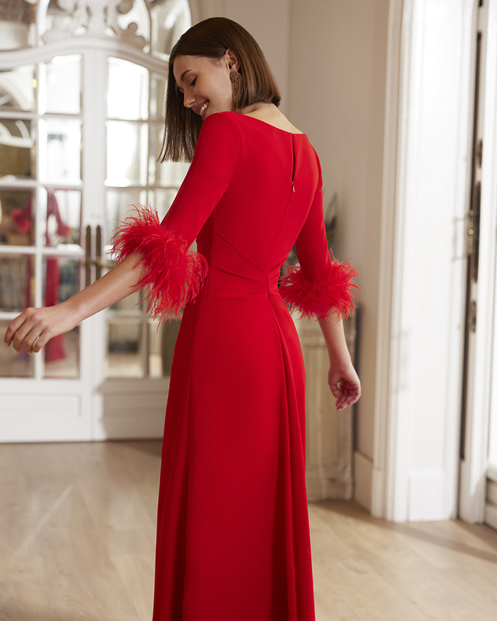 Vestido largo rojo de crepé con manga francesa terminada en plumas. Corte entallado en cintura y falda evasé con caída natural. Escote redondo en la espalda.