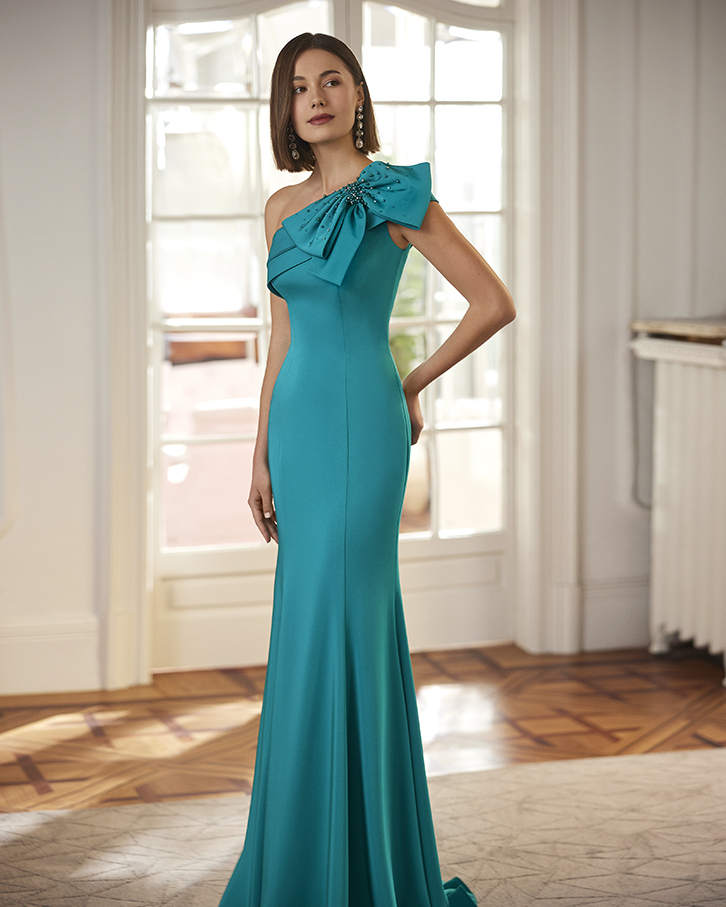 Vestido largo azul turquesa de crepé con escote asimétrico y gran lazo estructurado en el hombro, adornado con pedrería. Silueta sirena ajustada con cola.