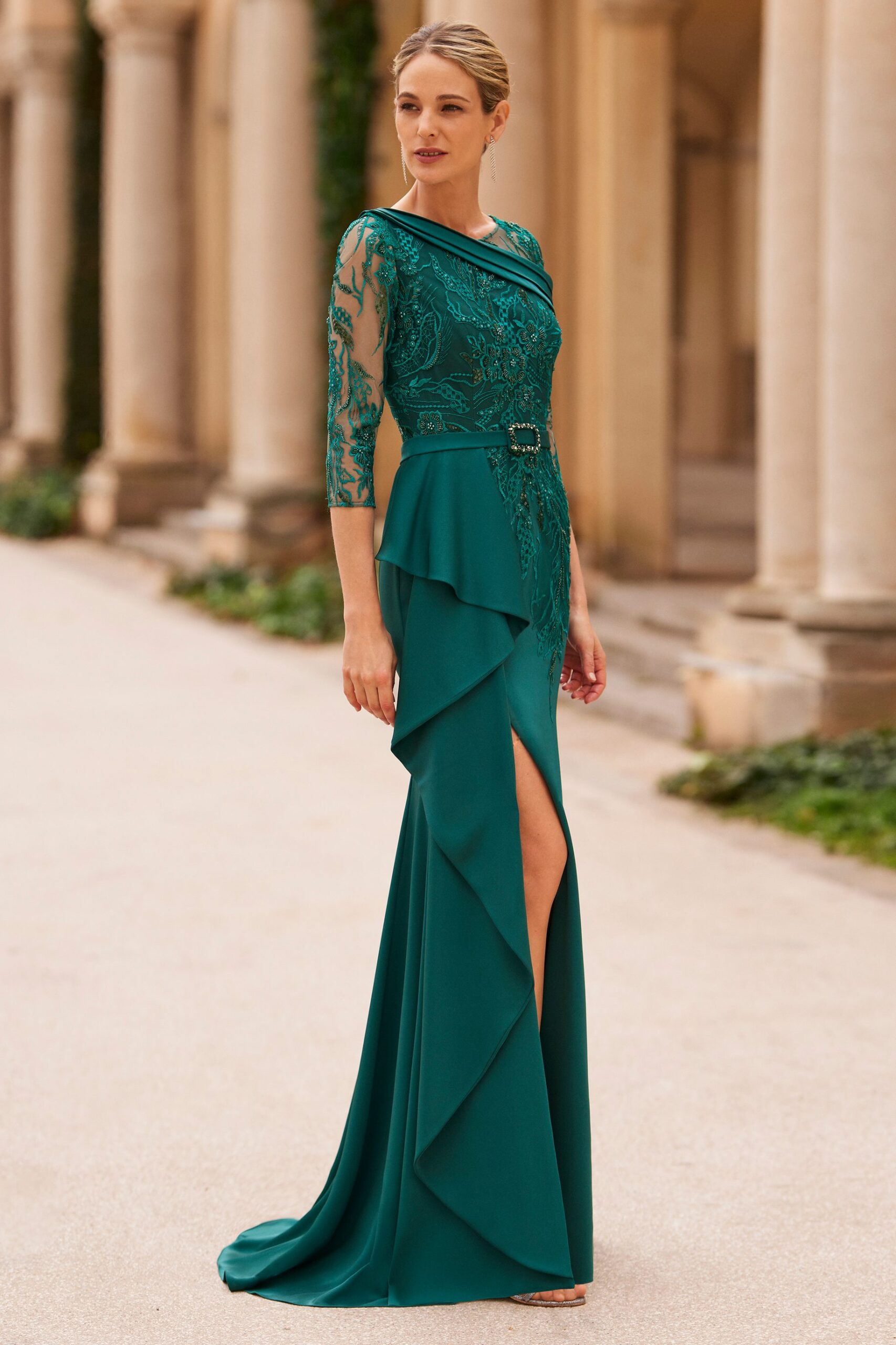 Vestido de madrina largo y estilo elegante en color verde.