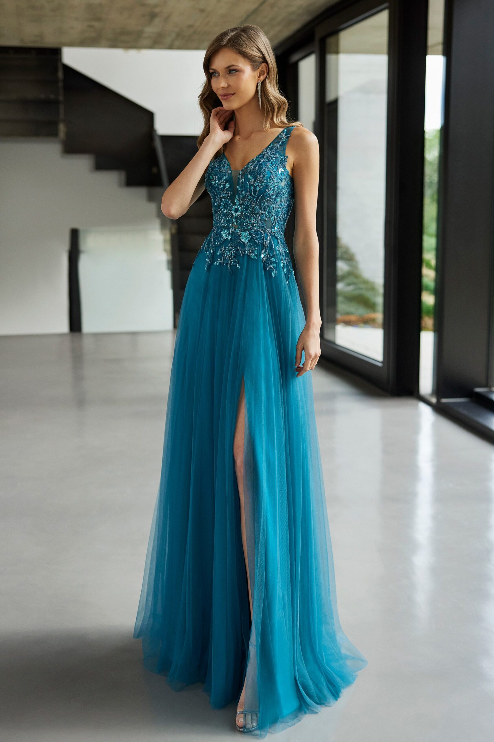 Vestido de fiesta largo y estilo elegante. Elaborado con tul y con encaje de pedrería.