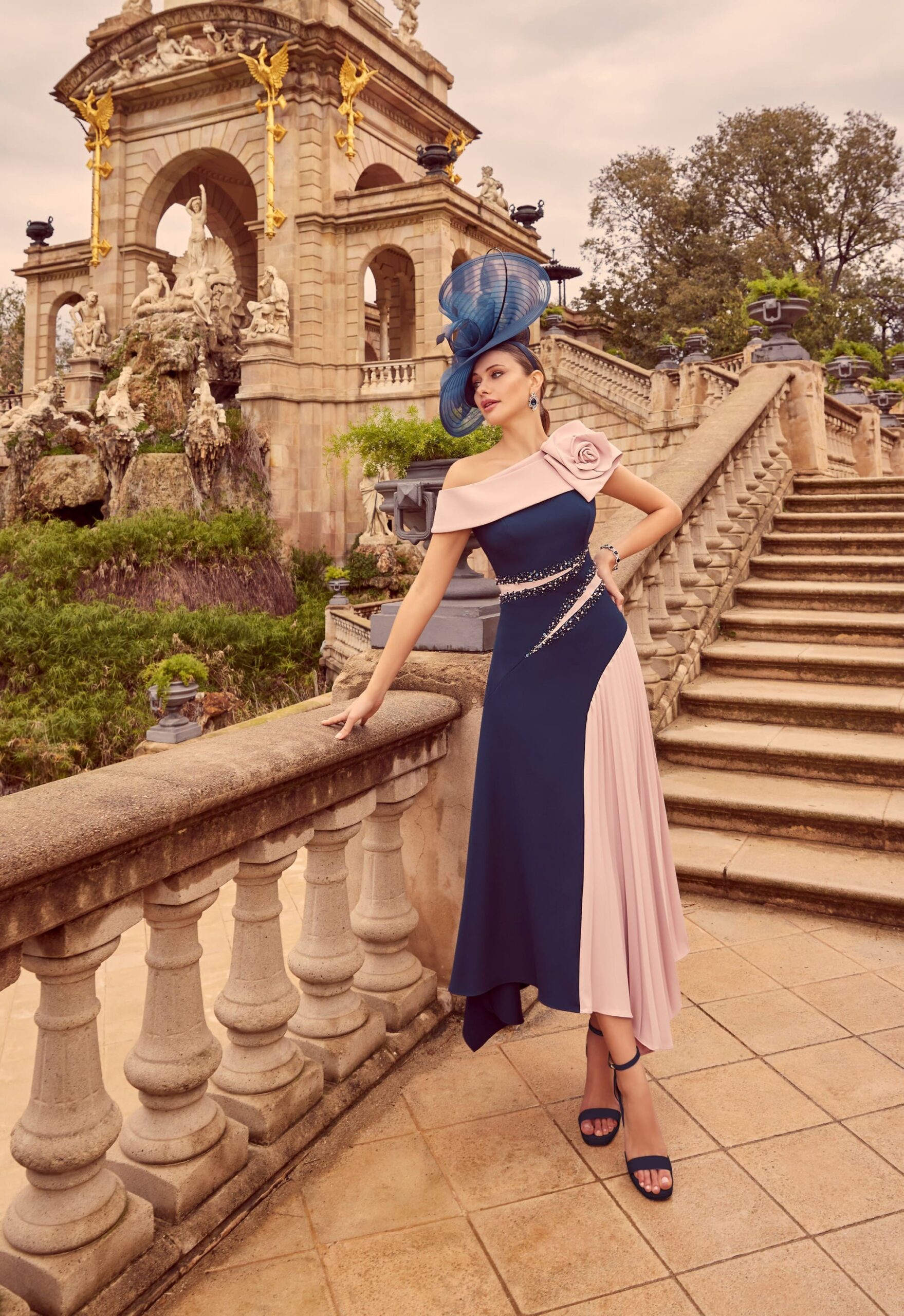 Vestido largo con escote asimétrico decorado con flor tridimensional en el hombro. Cuerpo entallado con cinturón joya y falda de doble tejido con panel plisado lateral. Tocado de gran volumen con base curva.