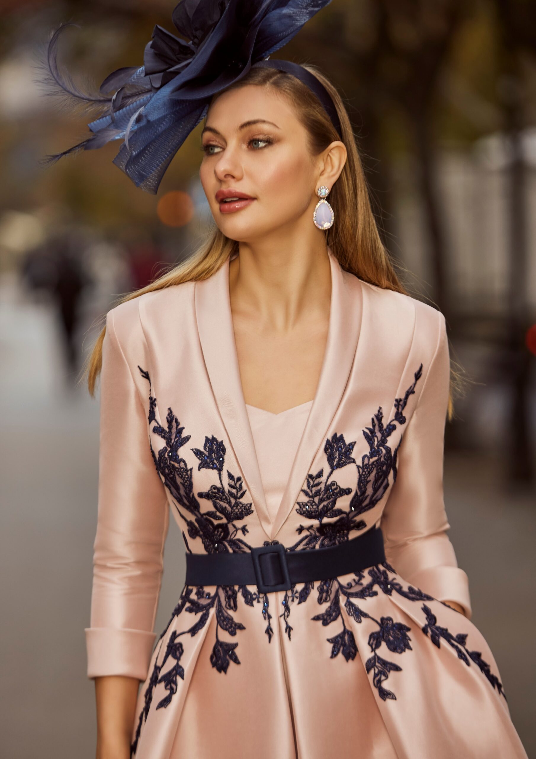 Vestido de largo midi con cuello solapa pronunciado y falda de vuelo. Cuerpo ajustado con bordados frontales y cinturón forrado. Tocado coordinado con aplicaciones florales.