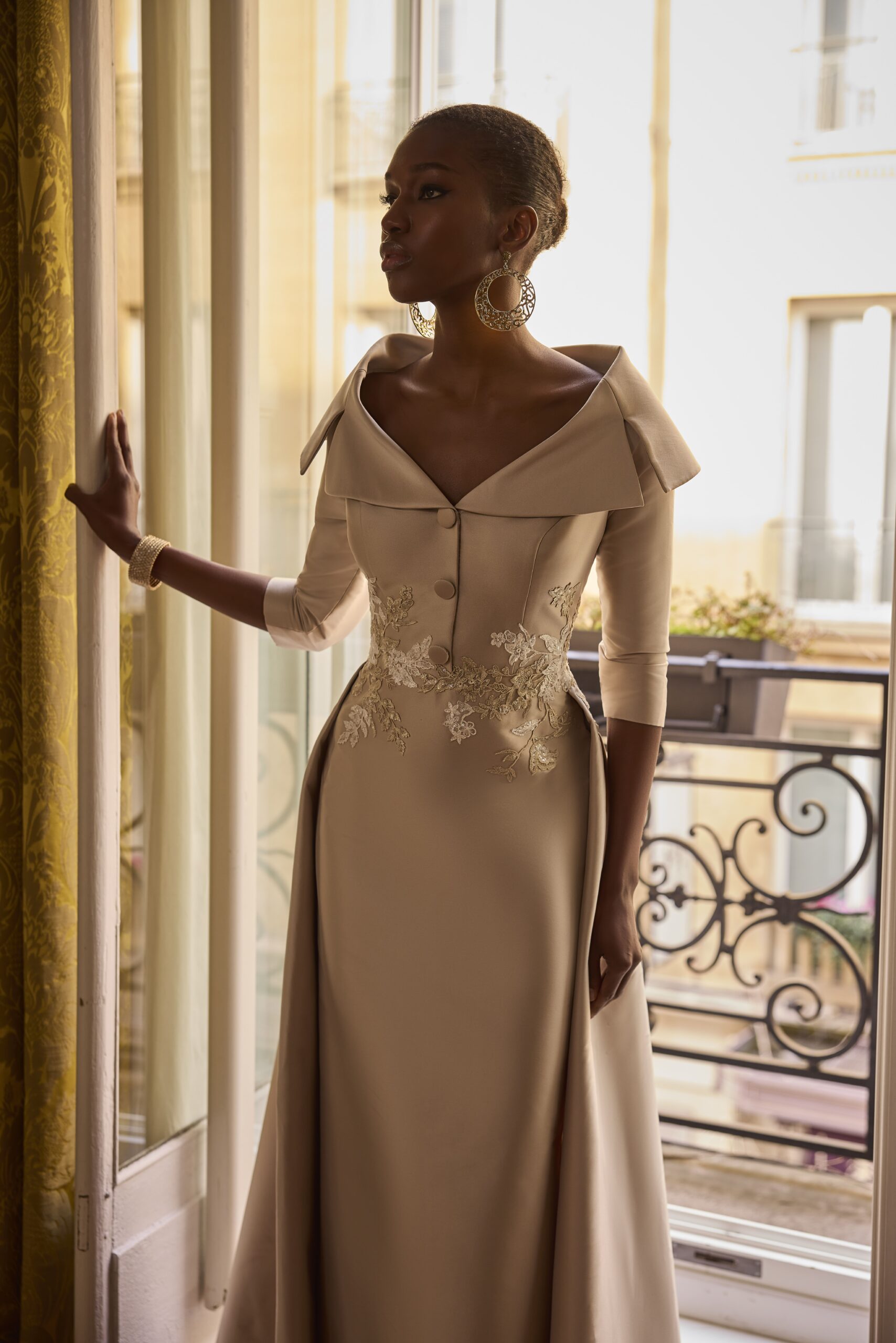 Las mangas tres cuartos equilibran la silueta, mientras que la falda larga, fluida y de caída perfecta, aporta majestuosidad sin perder ligereza. Los bordados florales en encaje marfil a la altura de la cintura aportan un toque romántico y artesanal.