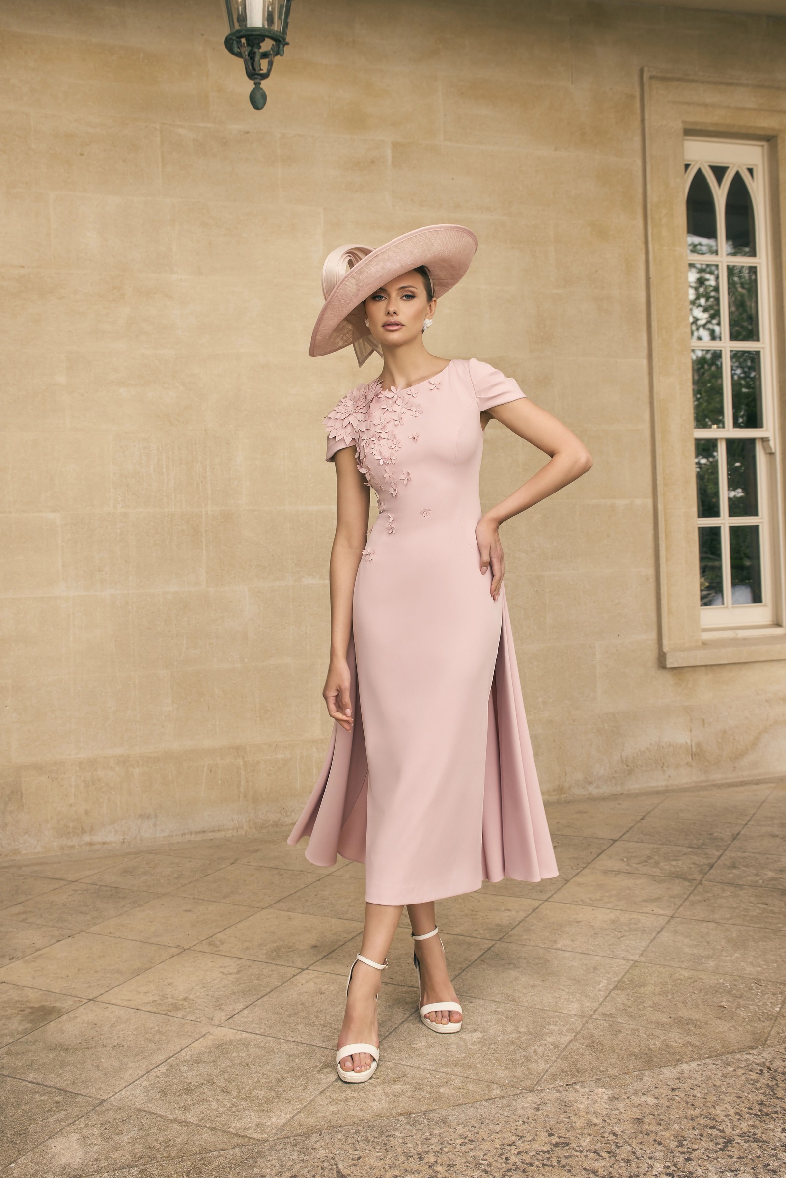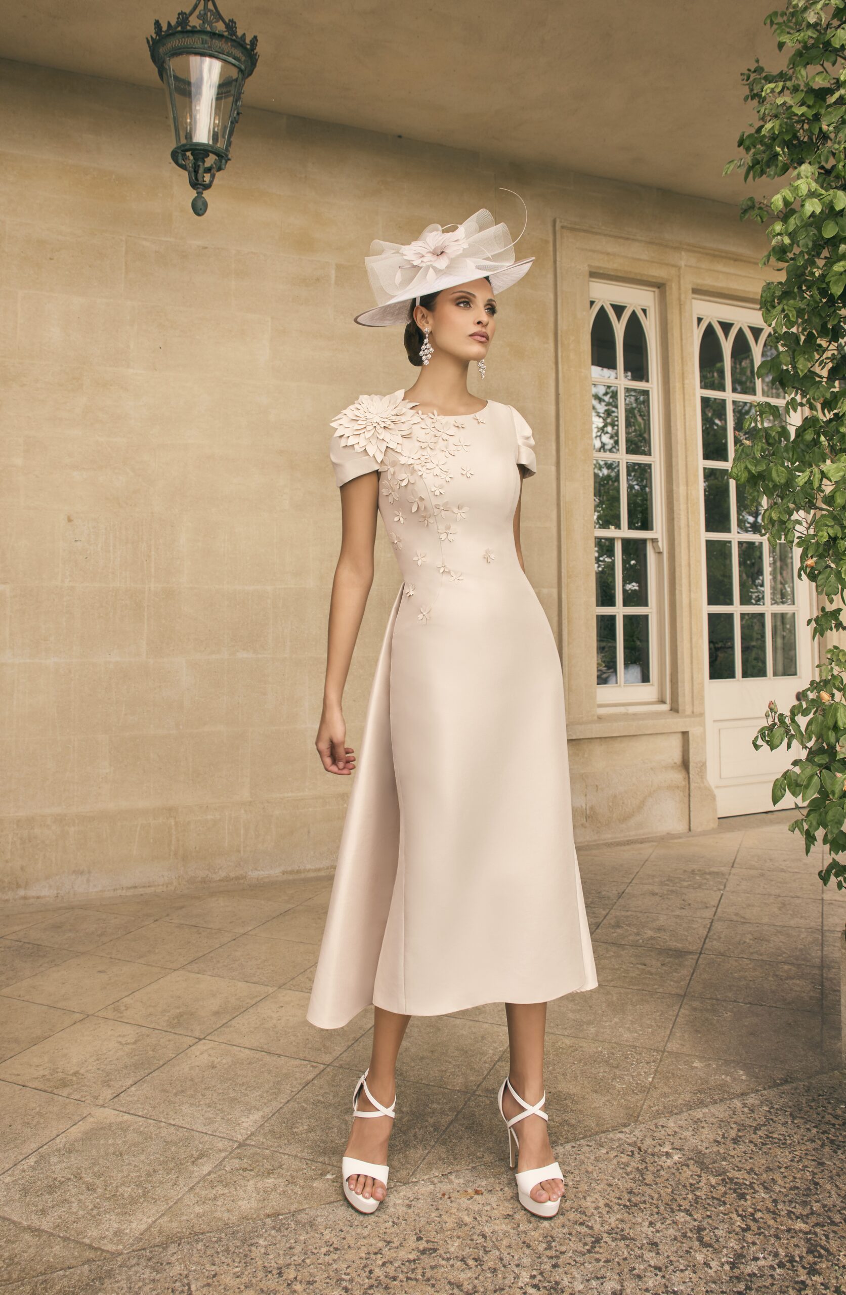 Vestido midi en tono champán satinado o nude, con manga corta estructurada y apliques florales en relieve sobre el hombro y el pecho. Corte en A con caída suave. Sombrero en sinamay natural con velo decorativo.