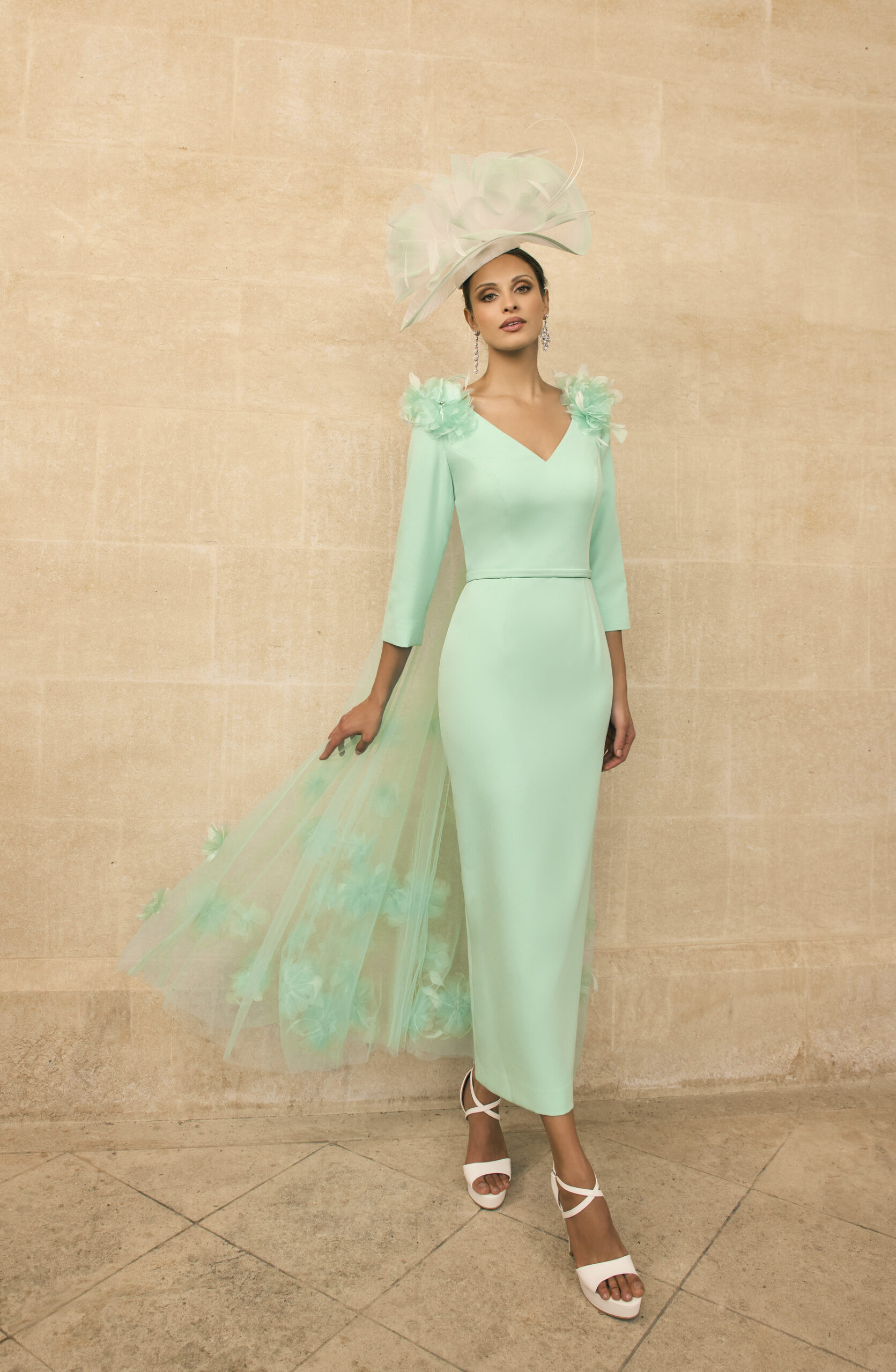 Vestido midi en color verde menta con silueta entallada, escote en pico y manga francesa. Detalle de flores aplicadas en los hombros y capa de tul semitransparente con aplicaciones florales que aporta ligereza y movimiento al conjunto.