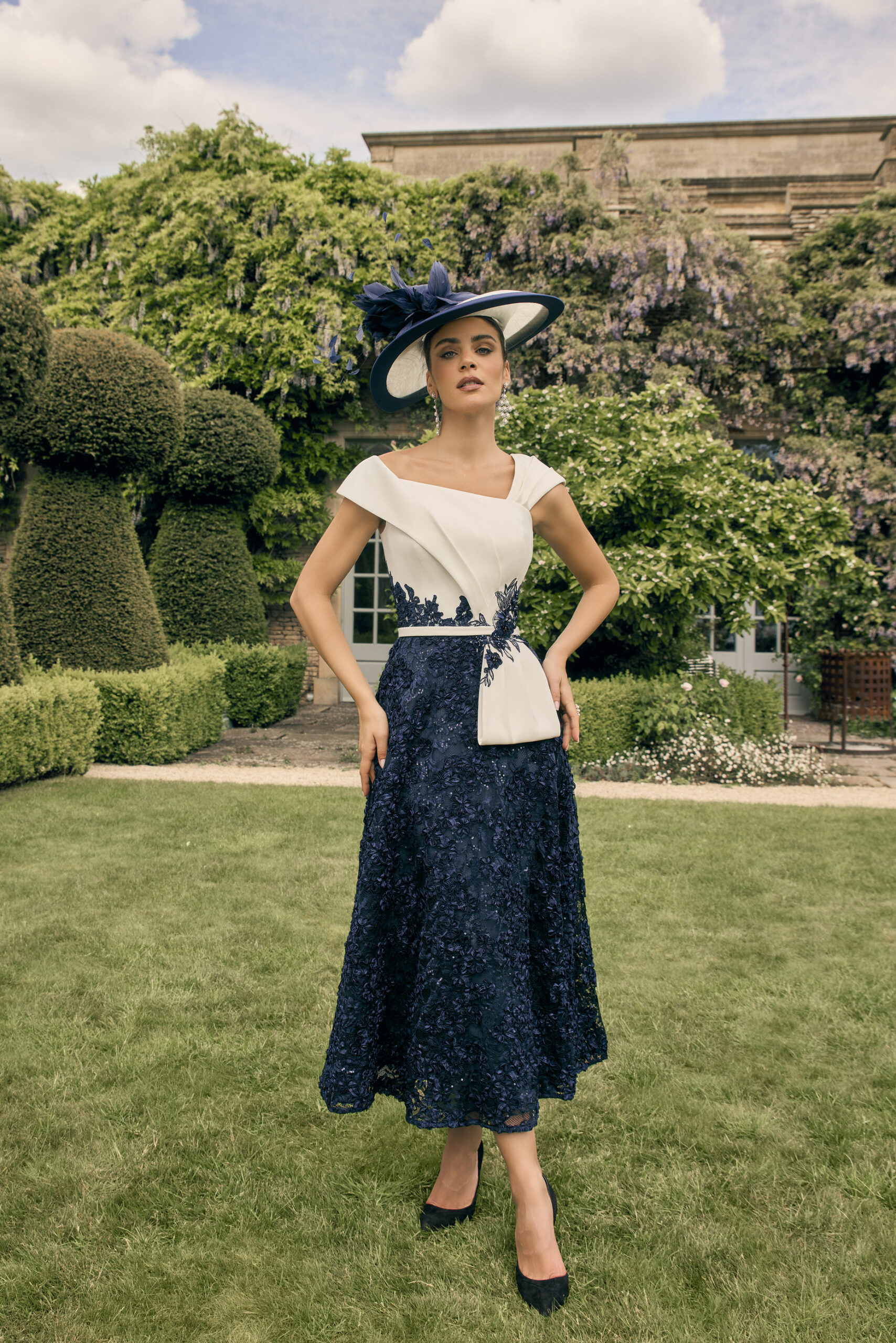 Vestido midi bicolor en tonos marfil y azul marino, con cuerpo estructurado de escote asimétrico y falda de encaje floral. Detalle de aplicaciones en la cintura que define la silueta y aporta contraste al diseño.