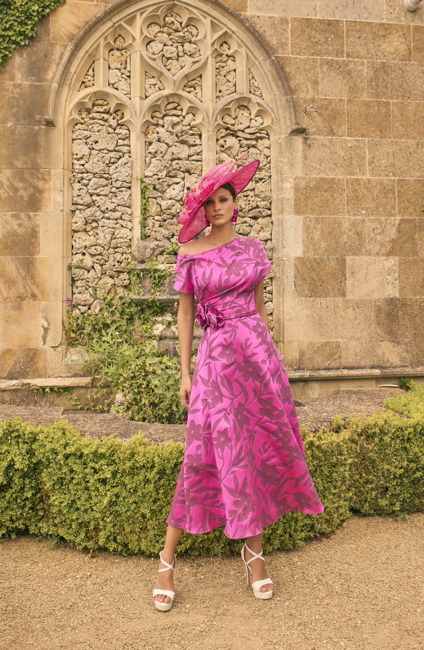 Vestido midi en tono rosa fucsia con estampado floral en relieve. Diseño de escote asimétrico y manga corta, con detalle de flor aplicada en la cintura que define la silueta. Falda de vuelo suave que aporta movimiento al conjunto.
