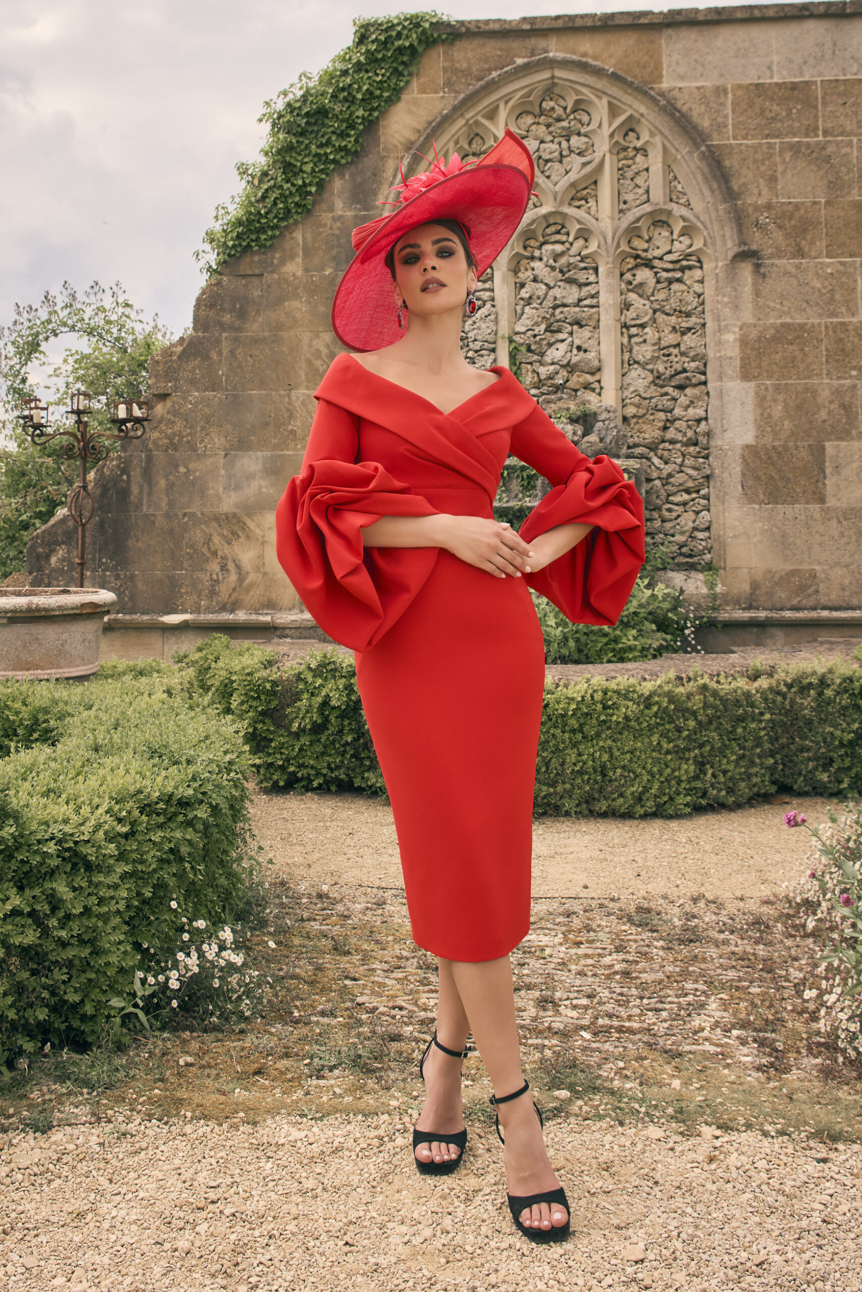 Vestido midi en color rojo intenso con escote cruzado y silueta ajustada. Diseño con mangas largas de volumen estructurado que aportan presencia y sofisticación. Falda recta de largo midi que estiliza la figura, ideal para eventos especiales y celebraciones formales.