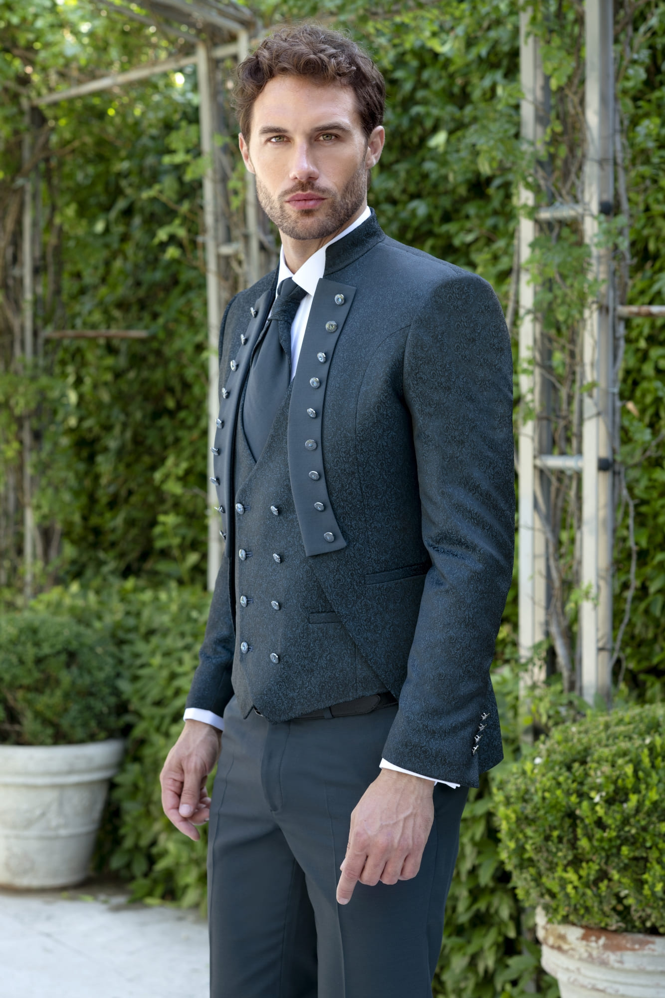 Elegante chaqué moderno en tono gris grafito, confeccionado en tejido brocado con dibujo discreto que aporta textura y profundidad al conjunto. La chaqueta corta con cuello mao y botonadura metálica doble proyecta una imagen distinguida y contemporánea. El chaleco a juego, de doble hilera, se combina con una camisa blanca clásica y un corbatón gris satinado