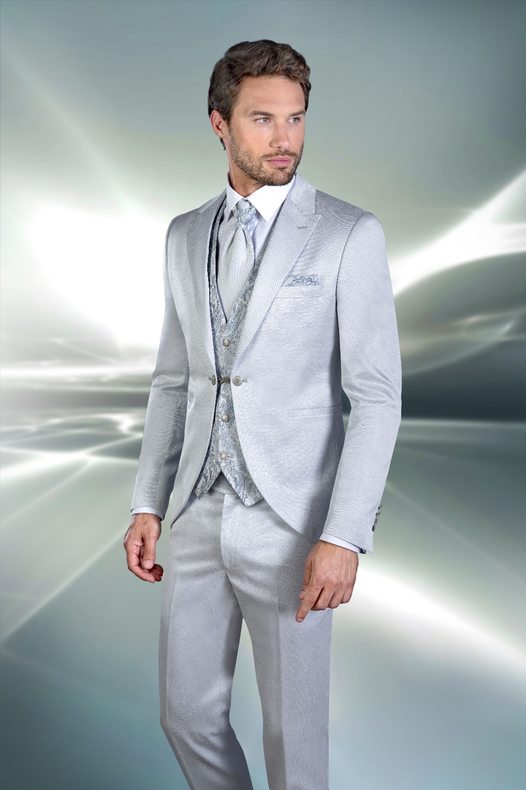 Elegante traje de novio en tono plateado claro. El conjunto incluye una chaqueta de corte entallado, combinada con un chaleco estampado a juego y corbata gris claro, ideal para ceremonias de día. La sofisticación de este diseño radica en la combinación de tonos monocromáticos que aportan un aire moderno y distinguido.