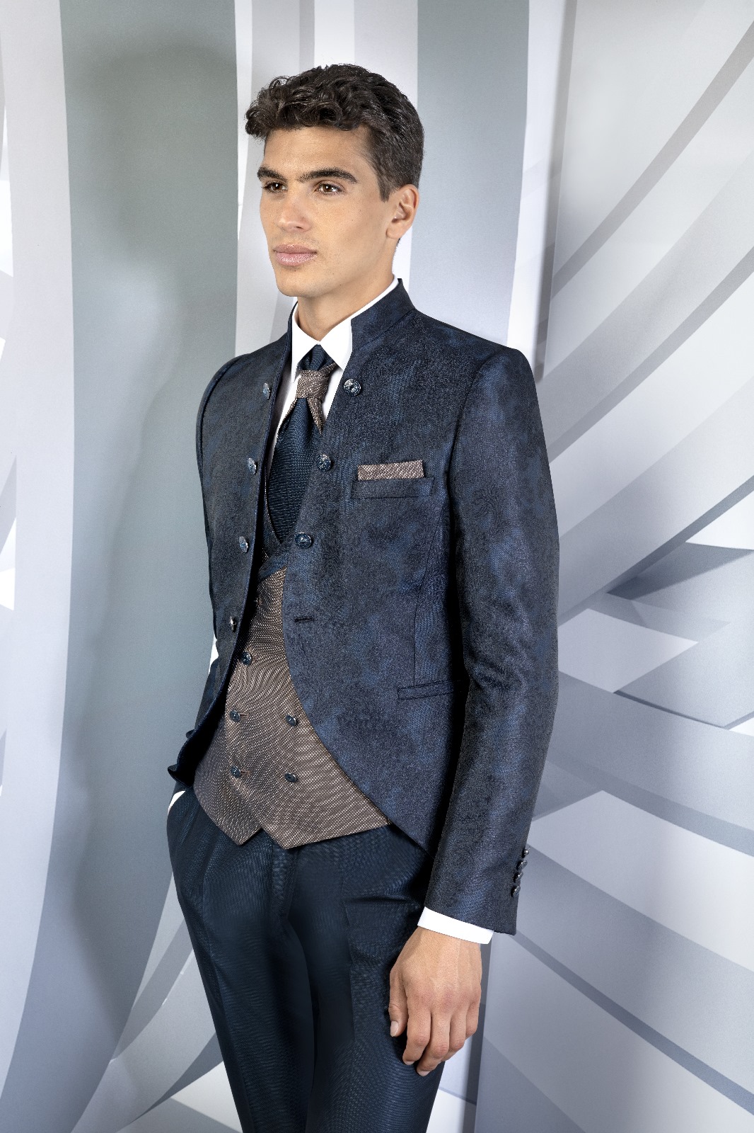 Este traje de novio en azul oscuro con detalles texturizados es una opción sofisticada y versátil. La chaqueta combina perfectamente con el chaleco de corte moderno en tonos marrones, añadiendo un toque de distinción y frescura a la tradicional paleta oscura.