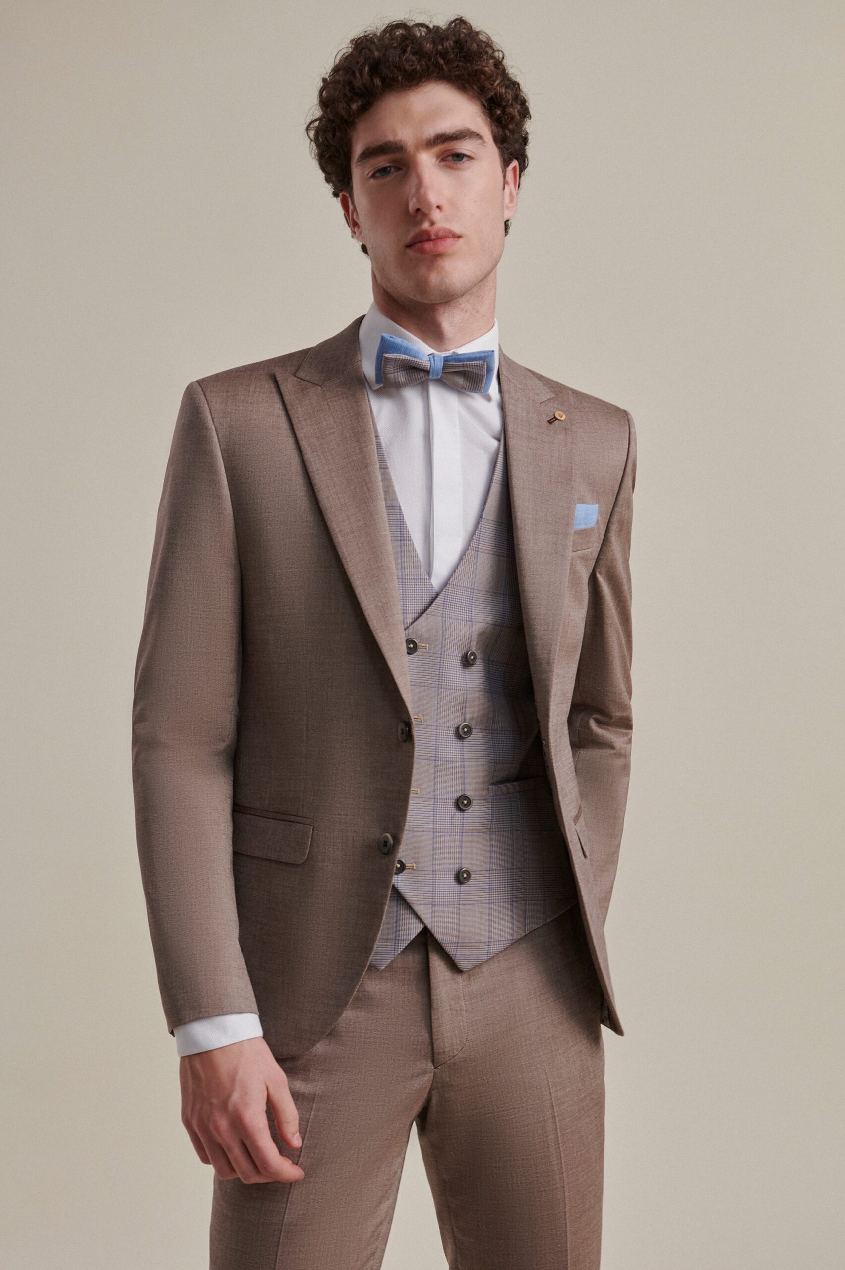 Este elegante traje en tonos marrones destaca por su diseño moderno y refinado, perfecto para bodas o eventos formales. La chaqueta, de corte ajustado, combina de manera sofisticada con un chaleco cruzado de seis botones en un patrón de cuadros con tonalidades azules, brindando un contraste sutil y elegante. La pajarita azul y el pañuelo de bolsillo a juego añaden un toque de color, manteniendo la armonía en el conjunto. El tejido de alta calidad ofrece una textura fina que se adapta bien a la silueta del cuerpo, proporcionando tanto comodidad como estilo en cualquier ocasión.