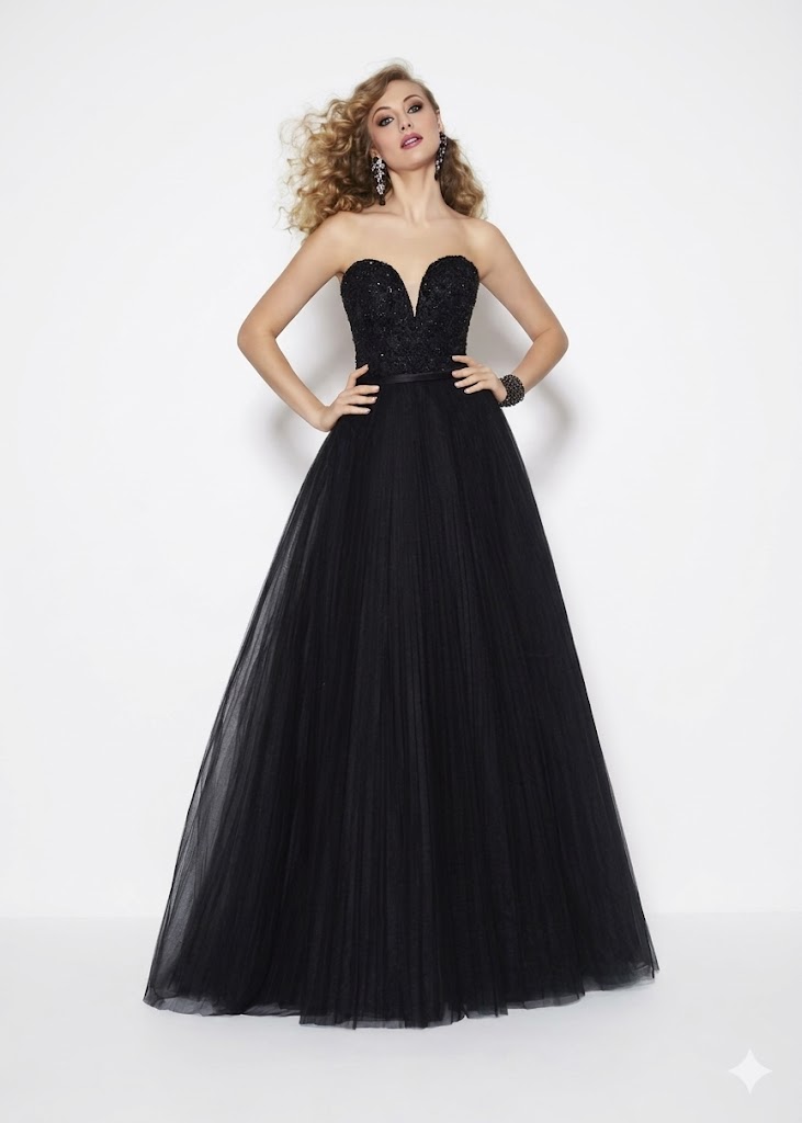 Diseño de gala palabra de honor en tul negro, con corte princesa y falda amplia de caída vaporosa. El cuerpo ajustado presenta un escote corazón profundo adornado con pedrería y bordados tono sobre tono. Sin mangas ni tirantes, incorpora una delicada cinturilla que realza la figura y aporta un acabado elegante y sofisticado.