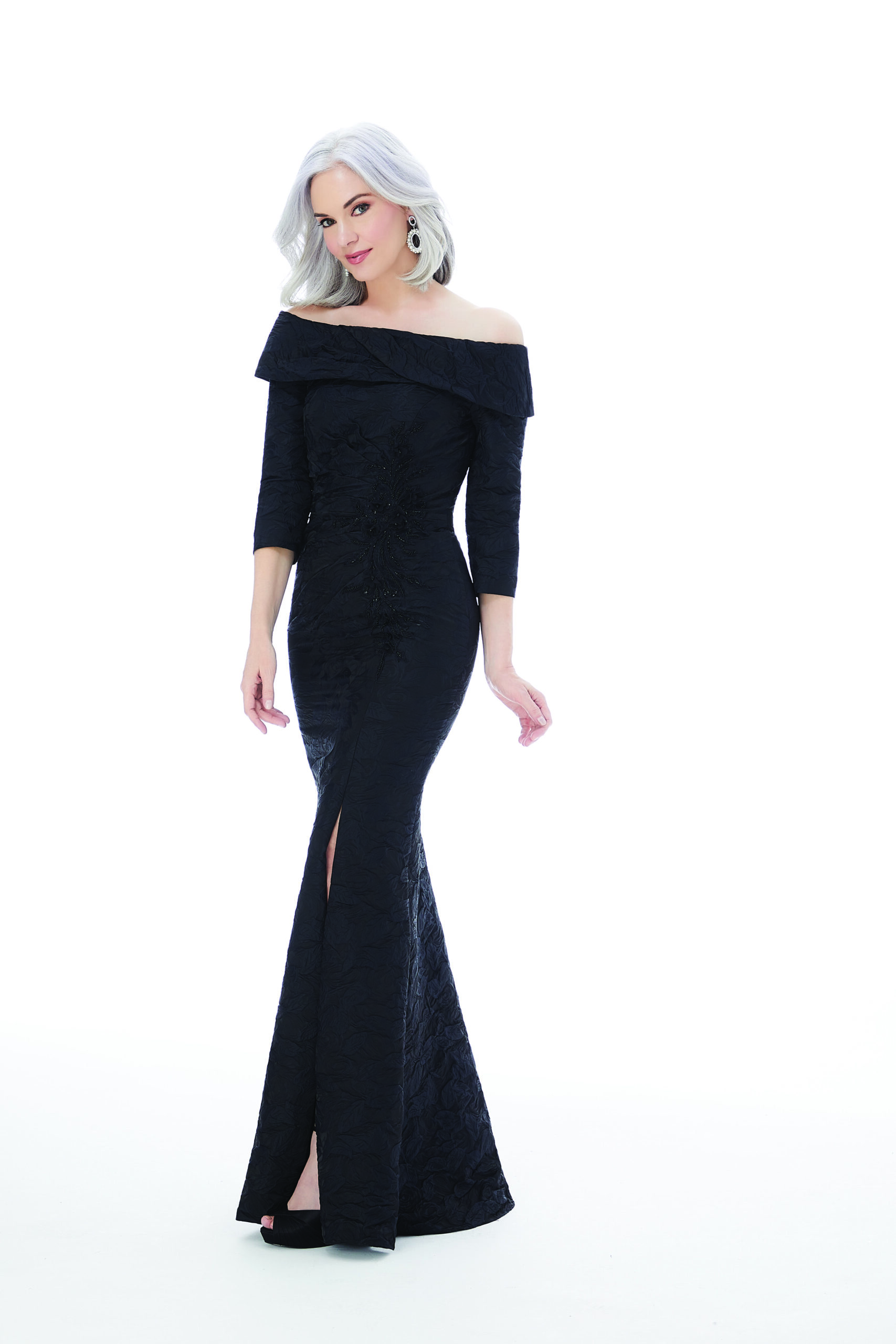 Elegante diseño largo de corte sirena confeccionado en tejido jacquard con relieve floral. Presenta escote bardot con solapa amplia que realza los hombros y mangas tres cuartos que aportan sofisticación. El entalle favorece la silueta y se complementa con una abertura frontal discreta que añade movimiento y feminidad al conjunto.